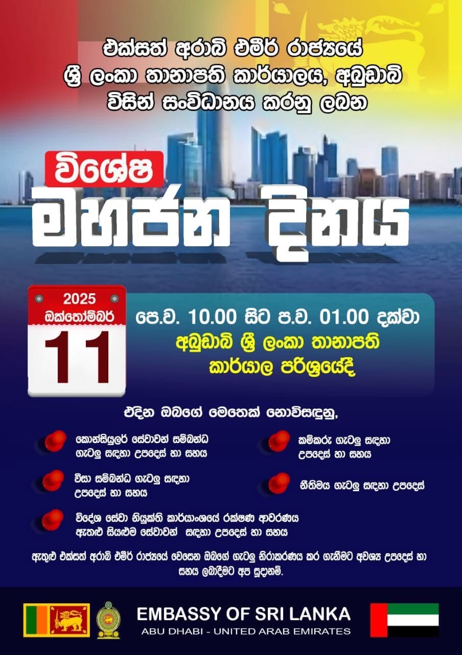 Public Day By Sri Lanka Embassy Abudhabi|2025-10-02T12:23:47+00:00October 2nd, 2025| Share This Story, Choose Your Platform! FacebookXRedditLinkedInWhatsAppTumblrPinterestVkEmail Related Posts Rebuild Sri Lanka Gallery Rebuild Sri Lanka 54th National Day of UAE.🇦🇪 Gallery 54th National Day of UAE.🇦🇪 Public Day Gallery Public Day Boat & Marine Show Gallery Boat & Marine Show Happy Deepavali Gallery Happy Deepavali